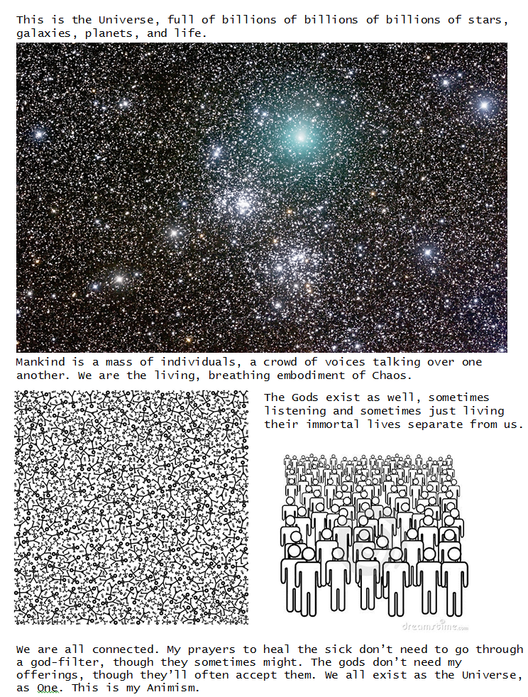 I often tell people I’m an animist first, and a Wiccan second. The way I view the universe is in its vastness and connectivity. I believe that all the gods exist just as real as you and me, hearing the prayers of worshippers and sometimes even answering them. I believe that they are connected to us just as we are connected to the trees, the air we breathe, and each other.