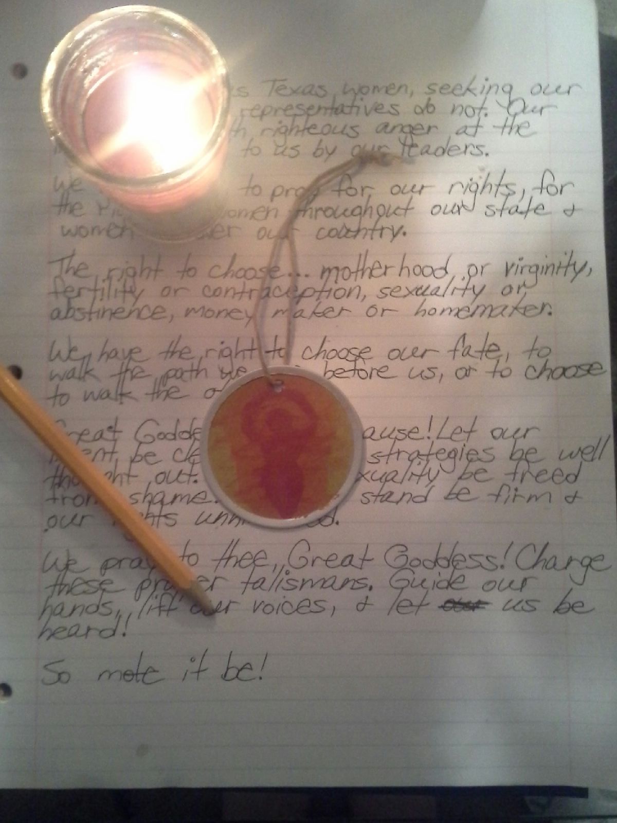 Protestors are descending on Austin today to speak out about the new special session. I have a dozen friends heading down there to shout and protest, while I’m stuck here at work. Knowing I’d be stuck out of the action, though, I wrote myself a little prayer. Keep in mind, I’m a pagan. I’ve always believed that prayer and magic have a huge influence on the world around us. By doing a prayer and creating a talisman, I’ve added my energies to those of the people who are actually there protesting in person.
